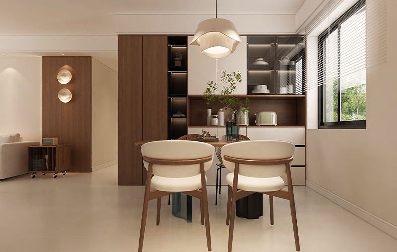 餐厅和厨房相连,便于家庭成员间的交流和互动。家具上选择实木餐桌和舒适的餐椅,提升用餐体验。定制足够的收纳空间的餐边柜来满足家里的储物收纳需求。在灯光上采用吊灯和辅助灯光来营造温馨的用餐氛围。